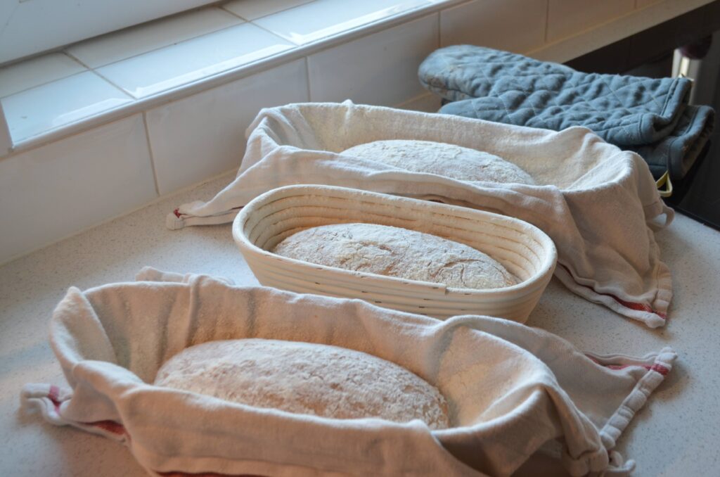 Ha kész a formánk készítsük elő egy szakajtót (tál is jó) amibe egy konyharuhát teszünk, majd lisztet szitálunk bele hogy a tészta ne tapadjon majd a konyharuhába. Ezután helyezzük bele úgy a tésztát, hogy a kenyér alja felülre kerüljön (hiszen ha sütünk akkor ki kell majd borítani). Újra szitáljunk a tésztára egy kis lisztet, majd takarjuk be konyharuhával. Itt dönthetünk úgy hogy 2-3 óra szobahőmérsékletű pihentetés után kisütjük a kenyeret vagy pedig hűtőben másnap reggelig hagyjuk kelni. Most a hűtős esetet írom le, így a betakart tésztát berakjuk a hűtőbe és másnap reggel fogjuk sütni.