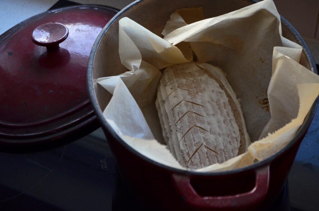 Másnap reggel 12 óra hűtőben pihenés után kivesszük a kenyeret a hűtőből és előmelegítjük a sütőt 250°C fokra. Ha van öntöttvas edényünk akkor azzal együtt melegítsük a sütőt de sima tepsiben is süthetünk. Amíg bemelegszik a sütő vegyük le a konyharuhát a tészta tetejéről, majd borítsunk rá egy sütőpapírt és óvatosan fordítsuk ki a pultra a szakajtóból a kenyeret. Vegyük le óvatosan a konyharuhát, ha jó a kenyér hidratációja és megfelelő mennyiségű lisztet használtunk nem szabad hogy a kenyér beleragadjon a konyharuhába. Most pedig fogjunk egy nagyon éles kést, de ami még jobb egy borotvapengét vagy speciális bemetsző kést és vágjuk be a kenyeret a kívánt mintára. Én általában keresztbe szoktam 3-4 bevágást ejteni, kb 2 cm mélyen, de lehet hosszában is 45°os szögben végig vágni, vagy bármilyen mintában amiben szeretnénk, viszont néhány dologra oda kell figyelni. Fontos hogy megfelelő mélységben vágjuk be a kenyeret, hiszen sütés során tágulni fog így fontos hogy a növekedést a bemetszéssel “irányítsuk” elkerülve azt hogy össze vissza repedezzen a kenyér.