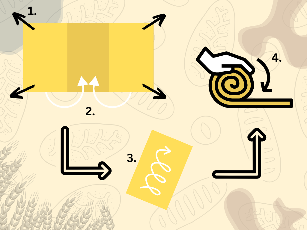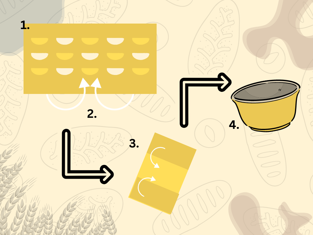 A következő lépésben már nem vesszük ki a tálból a tésztát, hanem abban fogjuk hajtogatni. A tálból óvatosan minden irányból a szélénél megfogva egy darabot a közepére hajtjuk, mint egy virág szirmai. Ezért is nevezik ezt sziromhajtásnak. Miután körbeértünk óvatosan ez egész tésztát fordítsuk meg a tálban hogy a behajtogatott részek alulra kerüljenek. Ezután ismét letakarva 2 óra pihenés következik.